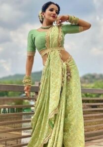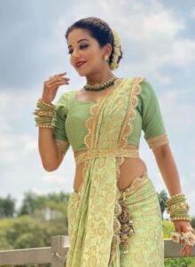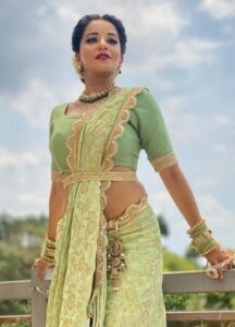 मोनालिसा (Monalisa) ने साड़ी को बंगाली स्टाइल में बांधा है। अपने लुक को परफेक्ट बनाने के लिए मोनालिसा ने अपने बालों को अच्छे से स्टाइल करने के साथ ही खूबसूरत ज्वैलरी भी पहनी है।