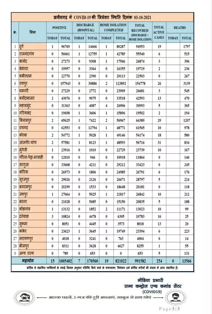 रायपुर।कोरोना वायरस को लेकर छत्तीसगढ़ स्वास्थ्य विभाग ने मेडिकल बुलेटिन जारी किया है. बुलेटिन के मुताबिक प्रदेश में आज 15 नए कोरोना पॉजिटिव मरीज़ों की पहचान की गई है. और 26 मरीज़ स्वस्थ होने के उपरांत डिस्चार्ज/रिकवर्ड हुए। वही प्रदेश में आज कोरोना संक्रमित एक भी मरीज की मौत नहीं हुई है.