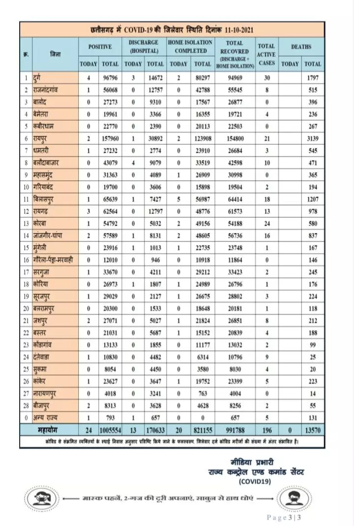 राज्य शासन के स्वास्थ्य विभाग के आंकड़ों के मुताबिक दुर्ग 4, राजनांदगांव 1, बालोद 0, बेमेतरा 0, कबीरधाम 0, रायपुर 2, धमतरी 1, बलौदाबाजार 0, महासमुंद 0, गरियाबंद 0, बिलासपुर 1, रायगढ़ 3, कोरबा 1, जांजगीर-चांपा 2, मुंगेली 0, जीपीएम 0, सरगुजा 1, कोरिया 0, सूरजपुर 1, बलरामपुर 0, जशपुर 2, बस्तर 0, कोंडागांव 0, दंतेवाड़ा 1, सुकमा 0, कांकेर 1, नारायणपुर 0, बीजापुर 2, अन्य राज्य 1 कोरोना पॉजिटिव मिले हैं।