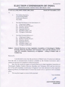 अब, छत्तीसगढ़, मध्य प्रदेश, मिजोरम, राजस्थान और तेलंगाना की राज्य विधानसभाओं के आम चुनाव, 2023 और नागालैंड के 43-तापी (एसटी) विधानसभा निर्वाचन क्षेत्र के लिए उप-चुनावों के परिणाम संबंधित रिटर्निंग द्वारा घोषित किए गए हैं. आदर्श आचार संहिता तत्काल प्रभाव से हटा दी गई है.