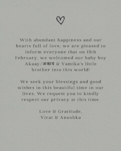 विराट कोहली ने सोशल मीडिया पर पोस्ट शेयर करते हुए इस बात की जानकारी दी है. और अपने बेटे का नाम भी रिविल किया है. उन्होंने अपने बेटे का नाम अकाय है. अनुष्का शर्मा ने 15 फरवरी को बच्चे को जन्म दिया.